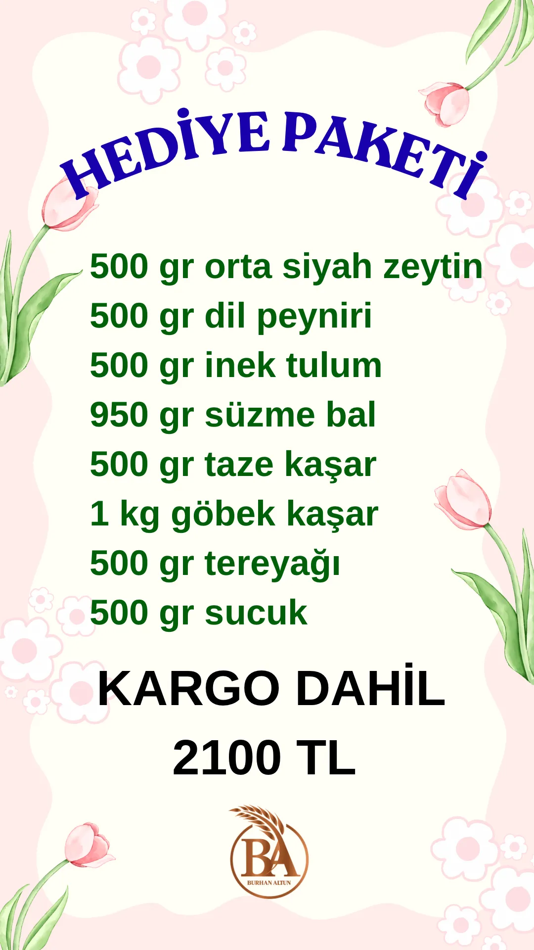 HEDİYE PAKETİ500 gr tereyağı 500 gr dil peyniri 500 gr sucuk 500 gr inek tulum 500 gr orta siyah zeytin 950 gr süzme bal&nbs..